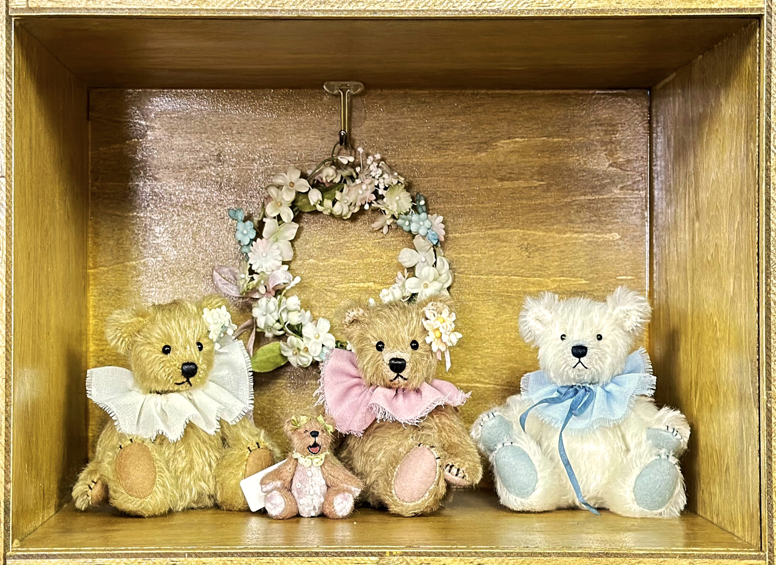 シュタイフシュルテのモヘアで作りました。色違いの3匹です。リボンや襟でおしゃれしました♡