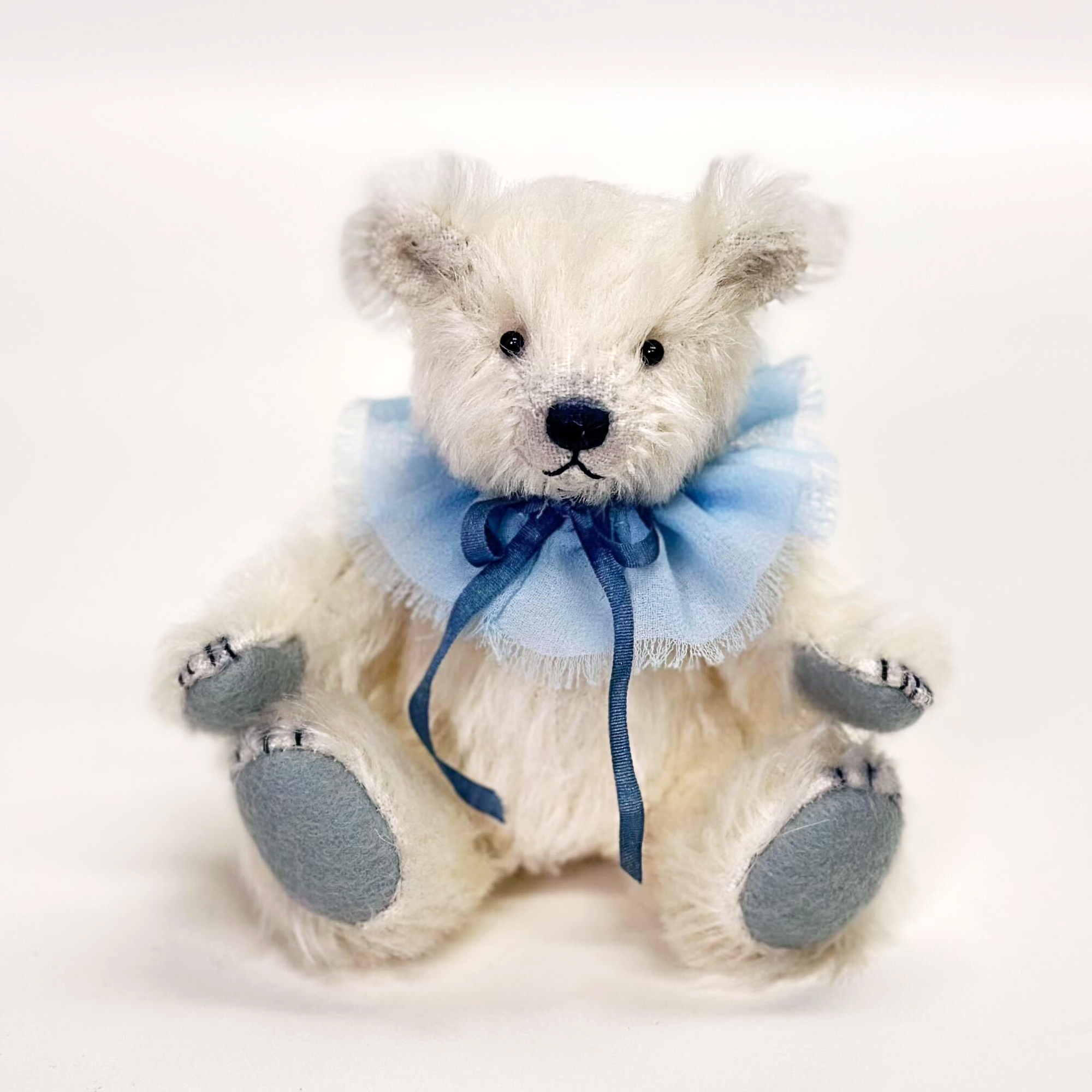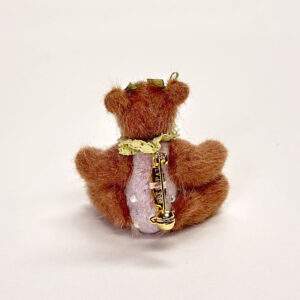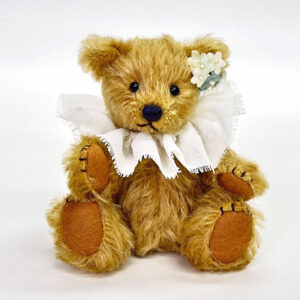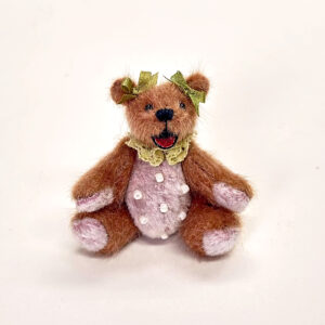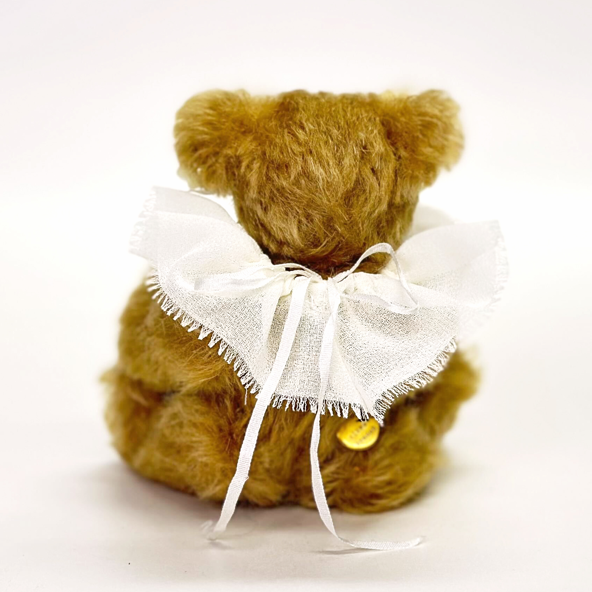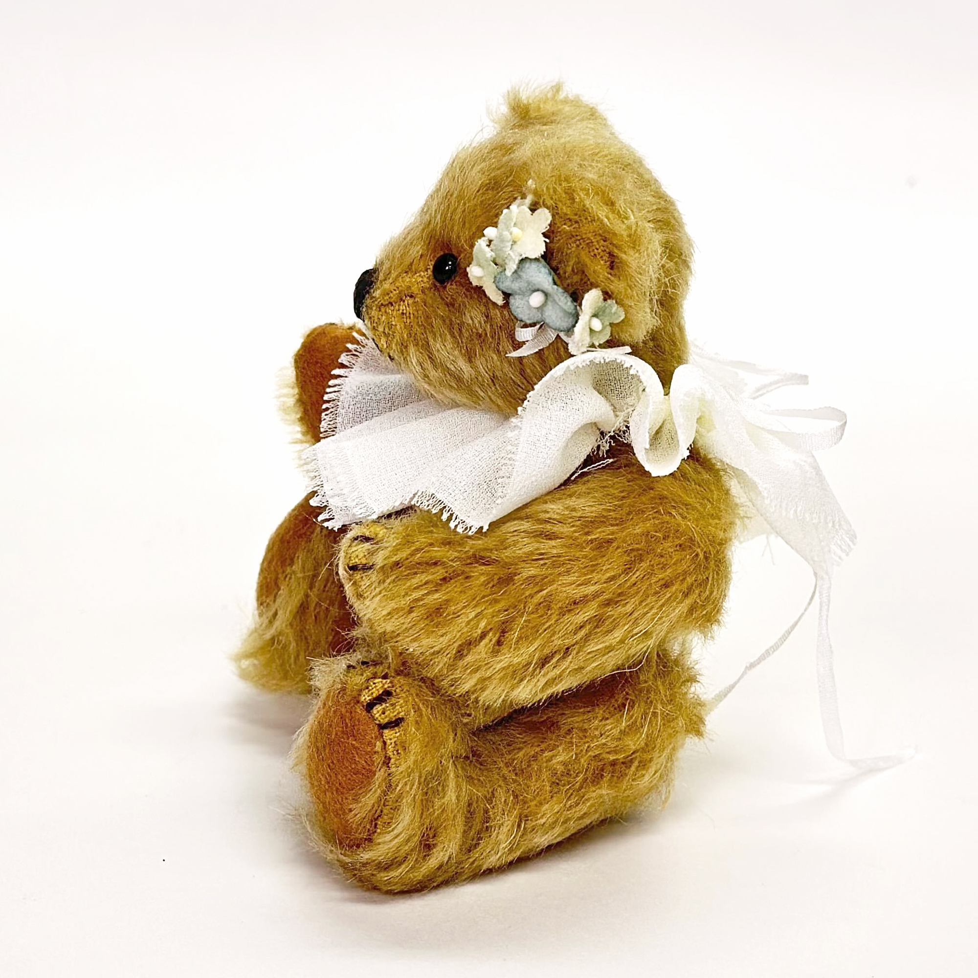使用材料:モヘア、ステンレスボール、綿、グラスアイ、ハードボードジョイント、フェルト、シフォンリボン、シルクリボン