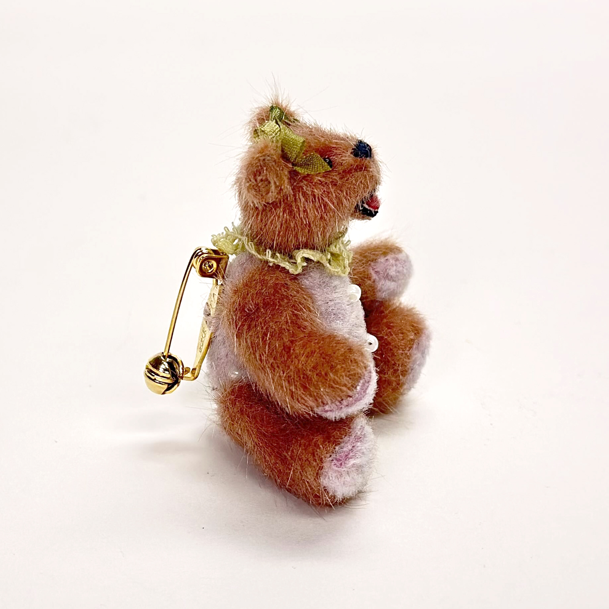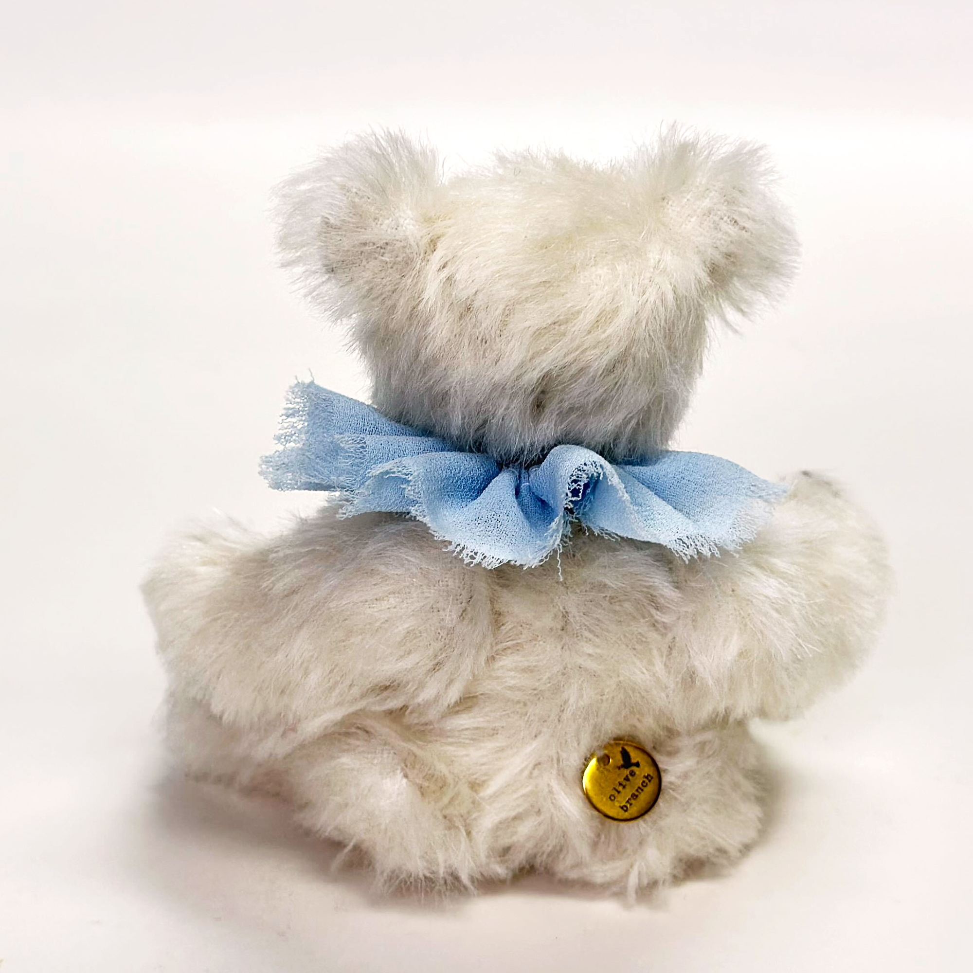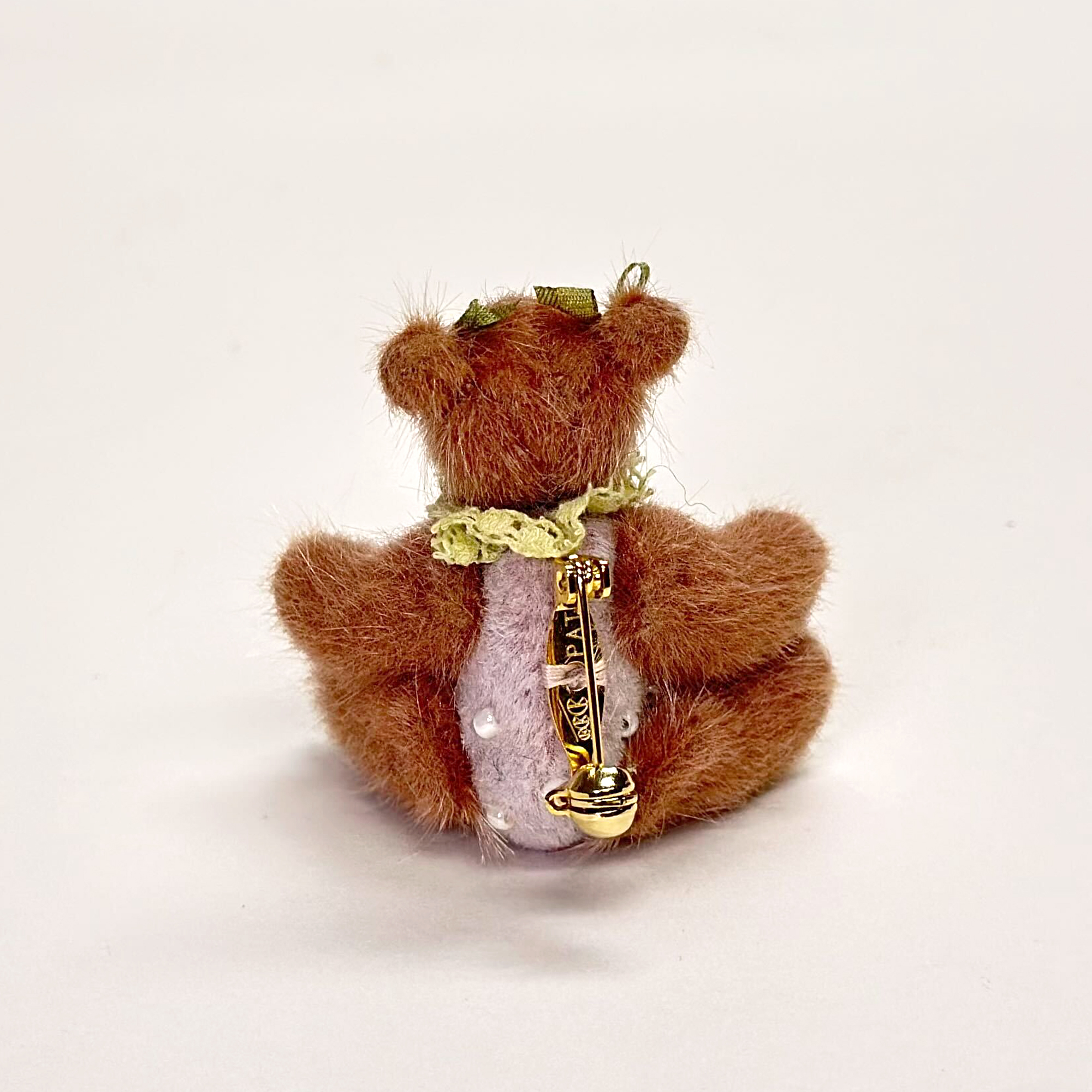 使用材料:ミニチュアファー、グラスアイ、ハードボードジョイント、綿、シルクリボン
